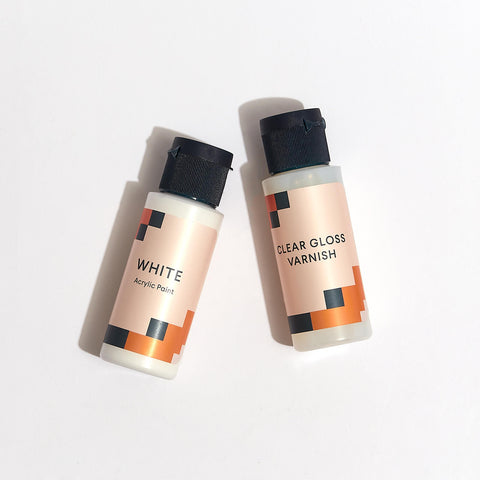 WEISS & LACK – Dieses Kit enthält eine 59-ml-Flasche mit weißer Farbe, die als Grundierung verwendet werden kann, und eine 59-ml-Flasche mit Lack/Versiegelung, die eine zusätzliche Schutzschicht bietet.